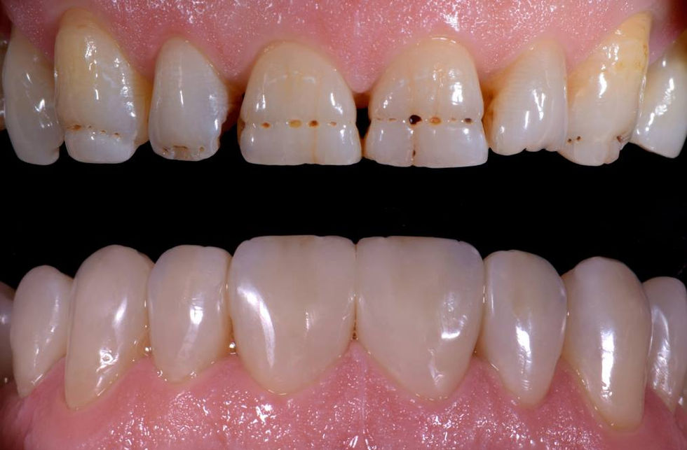 Disadvantage: Normally takes minimum 3-8 weeks as must be planned very carefully. Is more expensive than composite bonding (prices starting from £800.00 per tooth). Requires a mock up and prototypes made beforehand to make sure you are happy with the look of the teeth before proceeding. In many instances requires tooth preparation (i.e. we have to drill a small amount of the tooth away to create space for the veneer 0.3-1mm). This can result in post-operate sensitivity which is normally transient and settles over time. If it does not settle there is always a risk the tooth may require root canal treatment - although rare, this is a risk.